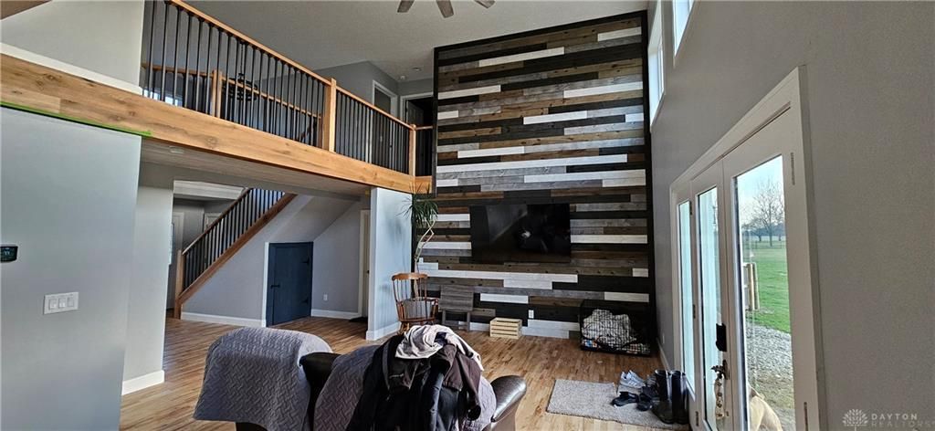Take in the splendor of this peaceful retreat, offering an exceptional blend of classic architectural style, advanced technology and expansive outdoor living. Curb appeal never disappoints with the tremendous front yard, well-kept landscaping and exterior accent lighting. The covered front porch ushers you inside to an awe inspiring, grand entrance. The living room captivates with high ceilings, gleaming reclaimed flooring, and a distinctive accent wall, creating an inviting open concept perfect for both relaxation and entertaining. The well appointed kitchen is a culinary dream, featuring abundant counter space, an inviting island, pristine white cabinetry, and overflowing natural light. The new Samsung smart appliances will make meal prep and clean up a breeze. Each bedroom provides a peaceful pause with warm neutral tones, ample natural light, and brand new carpeting. The custom designed stair railing and cat-walk leading to the upper level bedrooms highlights the open concept. The primary bedroom offers a private entrance from the covered porch and an en-suite bathroom, designed for luxury. A dedicated laundry space features modern appliances, ensuring convenient solutions for daily living. The 60x40 pole barn features a recreation room with a bar and a bathroom. Perfect for gathering for the big game, or with a little imagination, a multi-generational space. Durable siding and a newer Sheriff Goslin roof offer piece of mind. A spacious garage and an expansive barn provide ample room for storage and various activities. The generous, open landscape includes a tranquil pond, raised garden beds and vast green areas. The fenced pasture and shelter is an animal lover's dream. Smart thermostat, lights and appliances bring all of the thoughtful appointments together for a wonderous living experience. Essential amenities like central air, forced air heating, and a water softener ensure efficient home operation. All appliances and iPads for smart control will convey